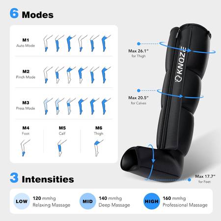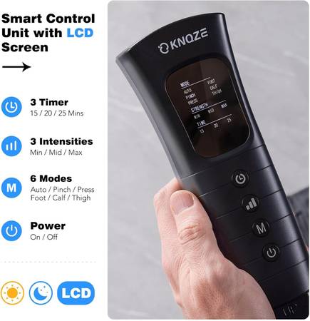 【6 Modes + 3 Intensities + 3 Adjustable Timers】Our upgraded electric air compression foot and leg massager boasting 6 adjustable modes, along with 3 pressure intensities (120-140-160mmHg) and 3 adjustable timers (15/20/25 mins). With an upgraded LCD controller, customization is a breeze.