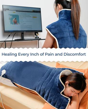 Weighted Heating Pad on Neck and Shoulders: This Neck and Shoulder Heating Pad measures 23“ x 35” and is designed with 3.4 lb. weighted technology and carefully filled with gravity beads on the shoulders and bottom of the heating pads to ensure a perfect fit with the curves of the neck, shoulders and lower back.This design not only effectively avoids sliding and reduces heat loss, but also helps relieve muscle tension and soreness. This heating pad is FSA HSA Eligible. An ideal gifts for mom, dad, wife, husband.