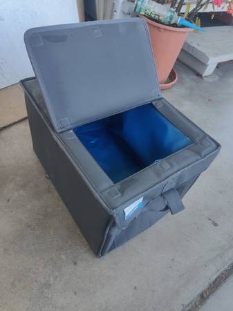 The EcoFreeze Stackable Tote was created for refrigeration during transportation. The walls of this tote were literally designed to freeze up like ice blocks. The sliding door allows for easy top loading. These sturdy totes can be stacked up to 4 units high. Originally designed for restaurants/kitchens to help with delivery service, but this insulated food tote can also be used by regular people for food transportation, like to a picnic or potluck.