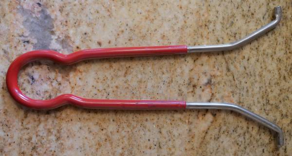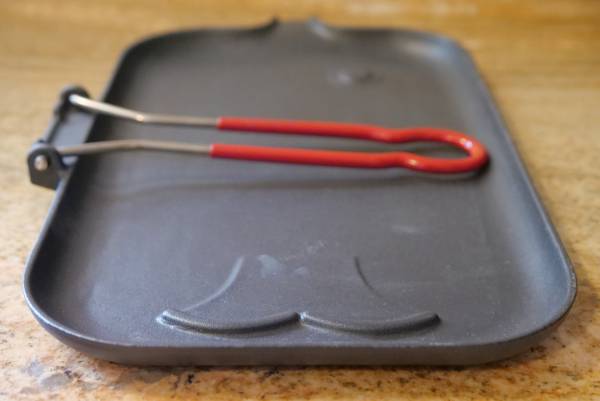 The retractable handle is constructed of stainless steel and red silicon-based polymer plastic. The handle measures about 8" long. When not in use, the handle retracts to minimize the footprint of the pan for storage. When in use, the handle pivots outward and locks into place.