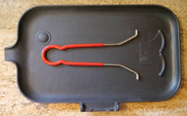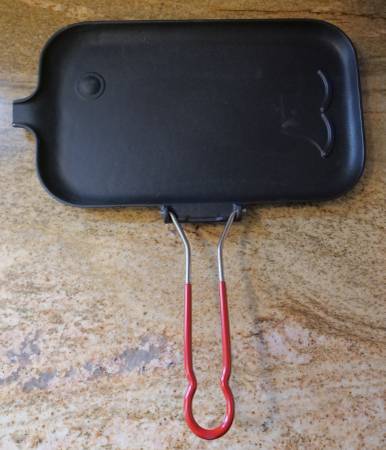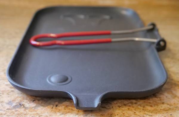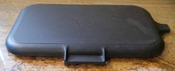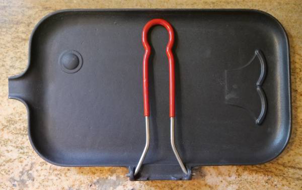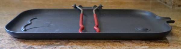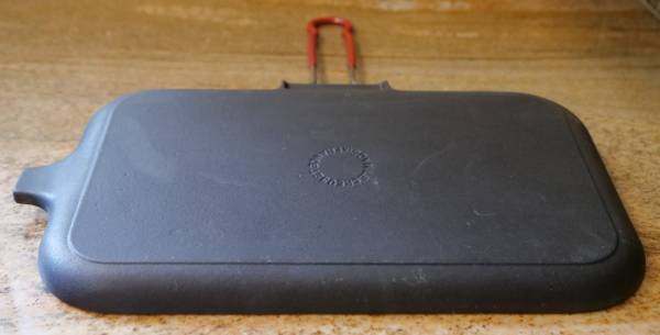 The pan is mainly constructed of high-quality cast iron. There is no enamel on this pan. The rectangular top surface of the pan measures about 13" wide and 8" deep. It has skillet-type walls on all four side that measure about 0.75" tall. On one side is a pour-spout that is about 1" wide and 1" deep.