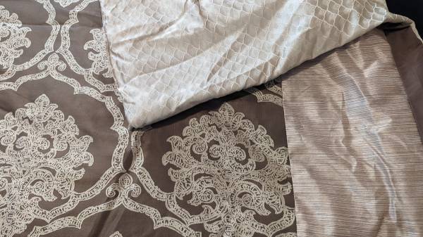 For sale is an elegant comfortable queen size bedding set in like new condition. The set has a reversible comforter with matching pair of pillow shams, bed skirt, pair of Euro shams and 3 decorative pillows. The 9 pieces set didn't come with the Euro pillows, we bought the 2 large Euro pillows separately for an other $40. I can include the 2 pillows for free when buying the set. So everything together, it's a 11 piece set. The comforter and the pillow covers were used for guests twice and all the other pieces are not used other than sitting on the bed in the guest room. Comforter, bed skirt and the pillow covers are washed and ready to use. Paid about $120 for the set and an other $40 for the Euro pillows. Asking $80.