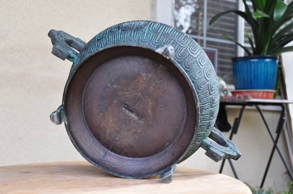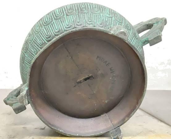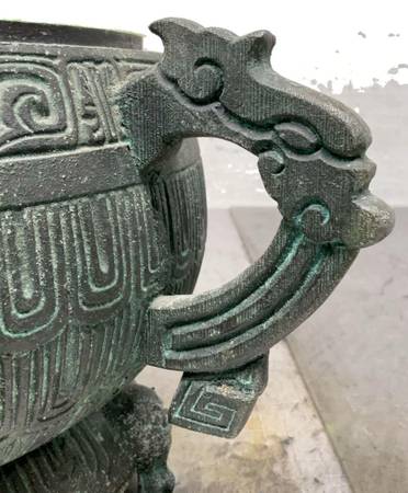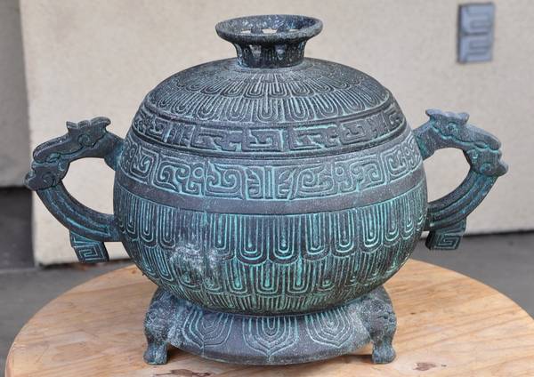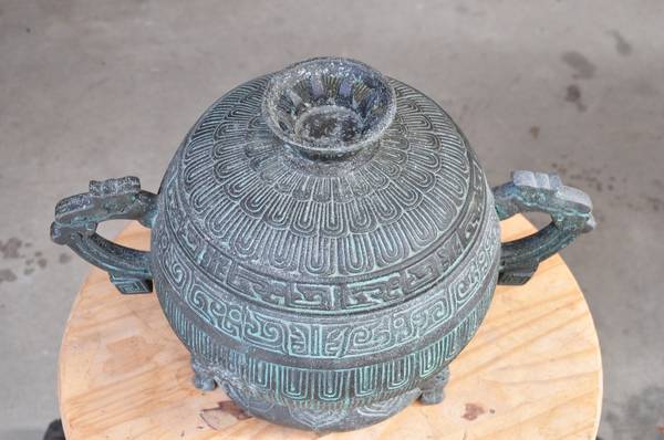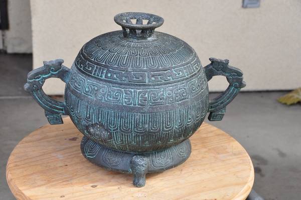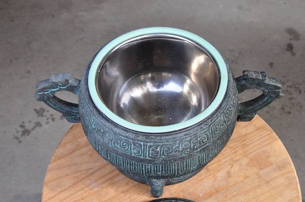 PICK UP FROM SAN JOSE or SANTA CLARA; SHIPPING CAN BE CONSIDERED. The outer metal vessel is styled in the for of an archaic Chinese vessel with relief features and handles. It has a stainless interior lining which cannot be removed. There is also a plastic layer as insulation. With the lid it is 17" wide (handle to handle), 11" deep, 11" tall and weigh around 7.5 lb. Without the lid it is 8" tall. Asking $225 (Or make offer).
