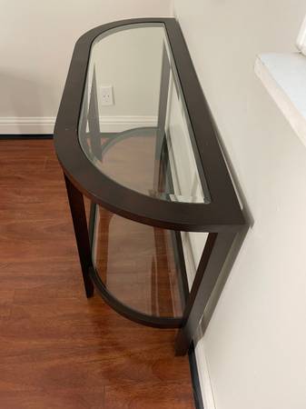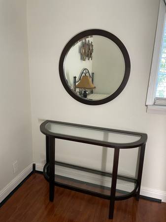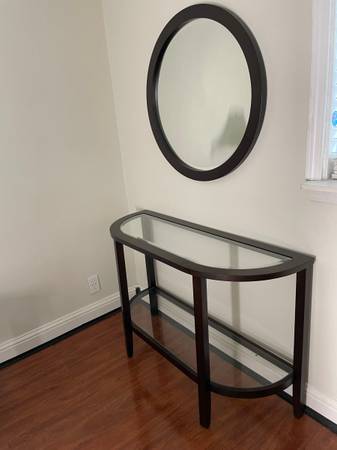Entry way table round mirror stylish entry console two tiers glass top. dark brown finish In great condition. Dimensions 46" X 16"X30" Comes from a Pets free and smoke free home. No delivery Local...