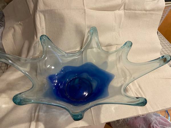Perfect centerpiece Blown glass bowl measures approx 28” x 18 x 12 No chips or nicks. Near new condition