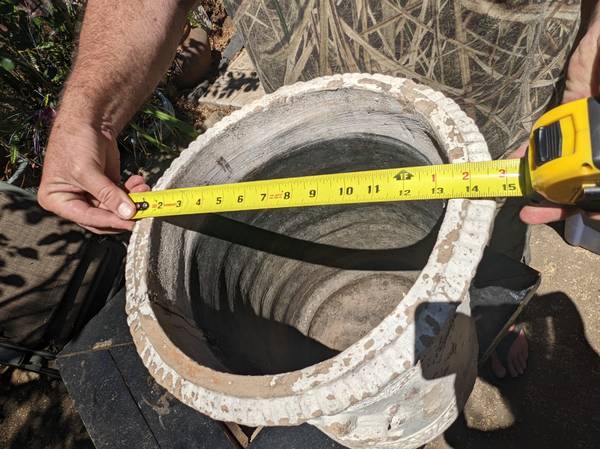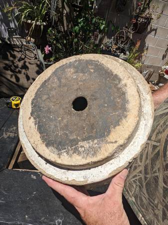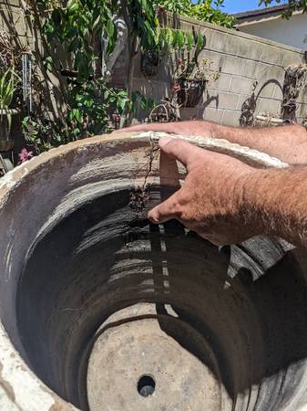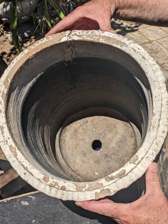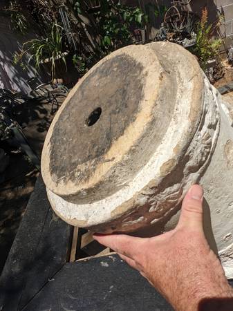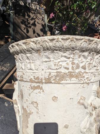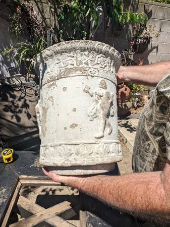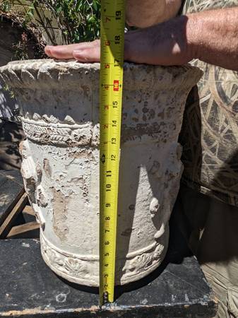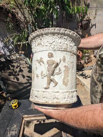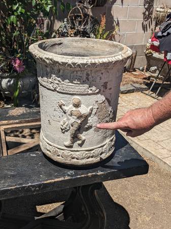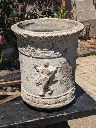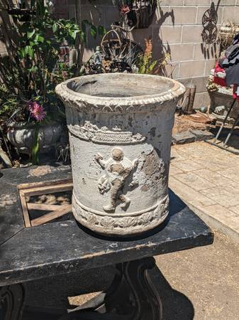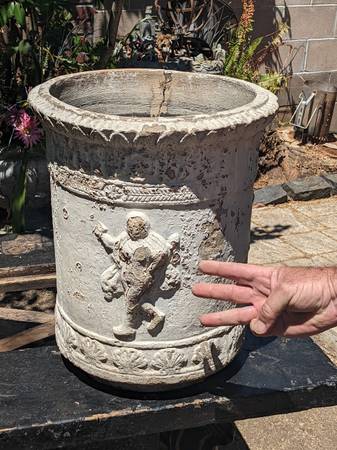 I have owned this old beauty for approx 30 years, I think it is late 1800s. It is a survivor. Was purchased at an estate sale from a very old house in Atherton. It is in the same condition as when I purchased it. I have had it protected from the elements. Body is strong and solid. Well built. Small old crack at the top..about 6 "...pictured, been there 30 years, its solid, does not affect the pots integrity. 3 interesting figures on the sides...all pictured. Drainage hole too. See pics for measurements.