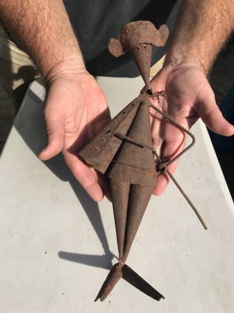 13" tall, from the estate of a long time collector of mid century art. Likely 60s or early 70s. Been outdoors, so rusty patine.
