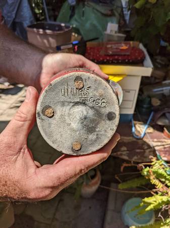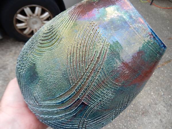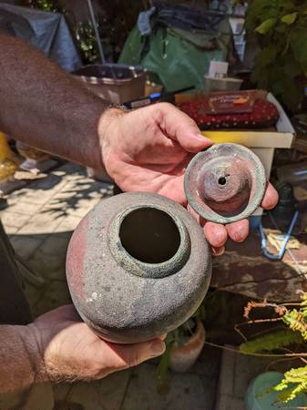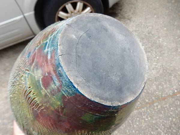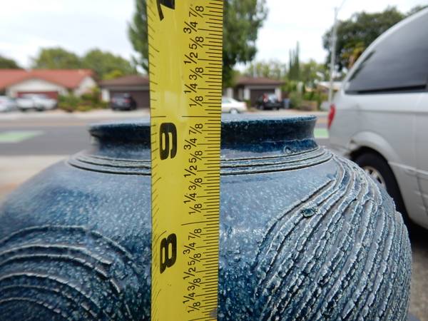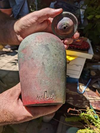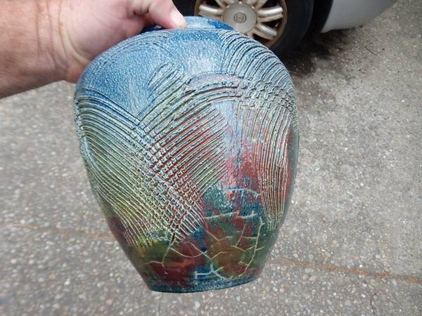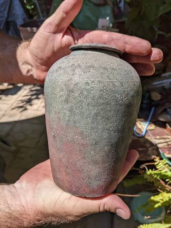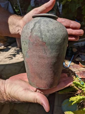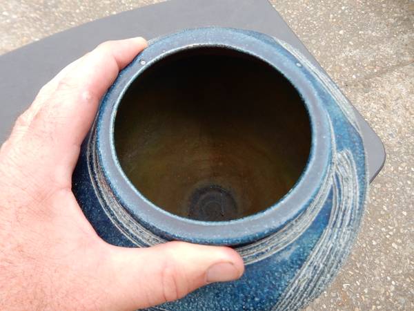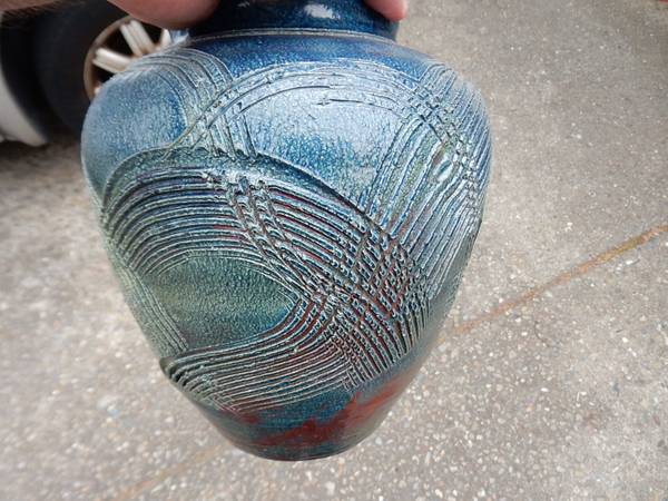art artist flower pot vase vace desk decor p20t vnt old signed table mid century midcentury asian japan japanese pottery fired ceramic glaze glazed stoneware studio bulbous retro iridescent crackle hand made handmade thrown clay rakus antique older home house decoration cabin office stage staging