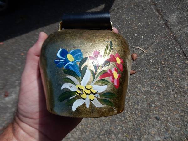 bells cows cattle vnt vintage old antique display wall hang hanging metal herd mountain Oakland athletics a`s a cowbell belle large small bull bulle Switzerland cheese brass collar primitive leather paint painted art artist hand made strap bard rustic farm house farmhouse cabin mt mountain salzburg Austria Austrian collect collection rare goat