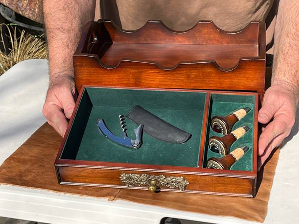 set lot cork screw stopper set wood wooden table serve serving hold holder rack cave cellar p10p white red port company foot footed drawer shelf coffee table serve winery estate nikhil Panchal nope!