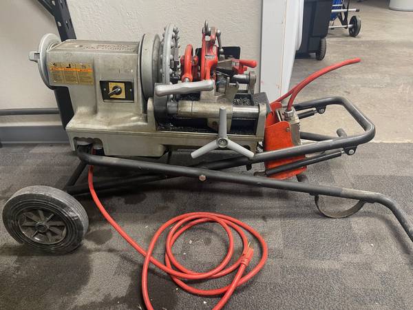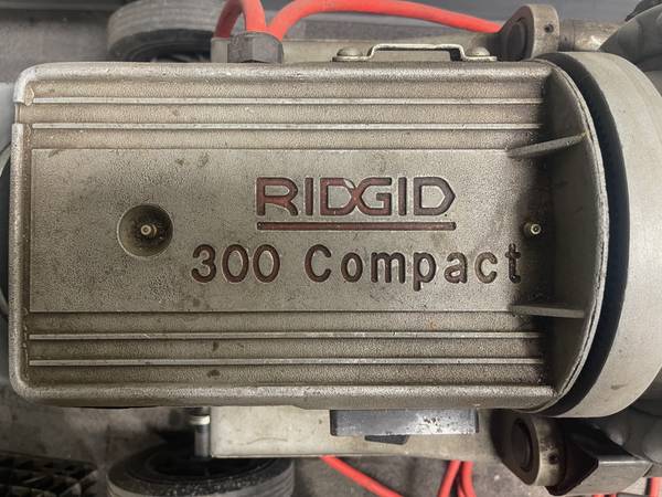 RIDGID 300 Compact Pipe Threading Machine w/collapsible stand and die head for 1/2" or 3/4" steel pipe. The pipe threader can accommodate up to a 2" pipe with the appropriate die head (not included).
