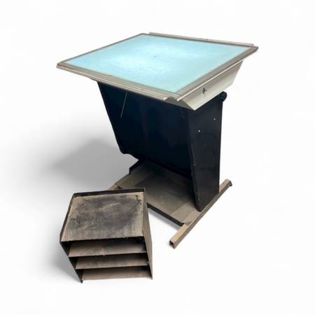 It has a tilted glass surface with built-in lighting, perfect for tracing, restoration projects, or use as a unique studio furniture piece.