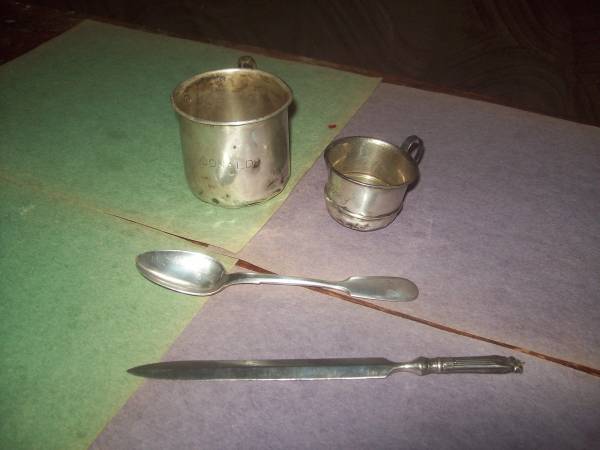 MIXED LOT SCRAP - TWO CUPS MARKED - STERLING SILVER , OLD LETTER OPENER KNIFE-HANDLE MARKED 800, HANDLE DAMAGES. OLD SILVER SPOON EUROPE MARKED 84 SILVER TOTAL WEIGHT 121 GRAM