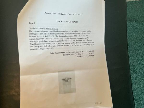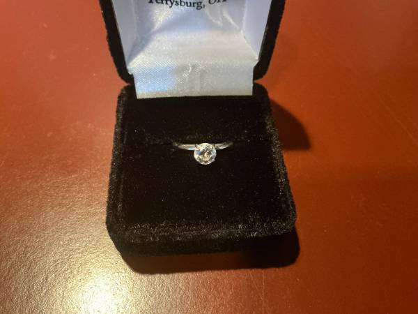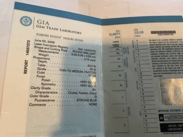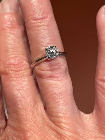 A diamond solitaire ring mounted on white gold. The ring contains one round brilliant cut diamond weighing .75 with a color grade of G and a clarity grade of SI1. Size 5.25. Beautiful sparkles....