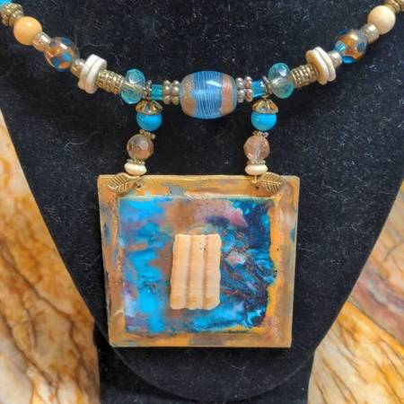 Beaded Blue-Gold necklace beads with abstract art pendant on a wire necklace with hook as closure. 6" wide