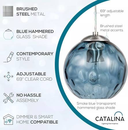 Catalina Lighting up to 69" Contemporary Small Hammered Glass Mini Pendant Ceiling Light, Blue, Classic Modern Kitchen Hanging Light Color is Blue-Green and can go with any decor in that range. New in Original Box - Was never installed or used. One unit is available