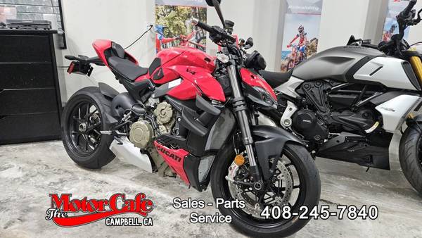 Engine Type: V4 Displacement: 67.3 cu. in. (1103 cc) Bore and Stroke: Bore: 3.19 in. (81 mm); Stroke: 2.11 in. (53.5 mm) Cooling: Liquid Compression Ratio: 14:1 Fuel System: Gas Transmission: Manual Final Drive: 2.8 Front Suspension: Inverted Fork Rear Suspension: Single Sided Swing Arm Front Brakes: Dual Hydraulic Disc Rear Brakes: Hydraulic Disc Front Tire: Pirelli Diablo Rosso IV Corsa 120/70 ZR17 Rear Tire: Pirelli Diablo Rosso IV Corsa 200/60 ZR17 Wheelbase: 58.6 in. (1488 mm) Seat Height: 33.3 in. (845 mm) Rake: 24.5 Trail: 4 in. (100 mm) Fuel Capacity: 4.5 gal. (17 L) Dry Weight: 397 lb. (180 kg.) Speedometer: Standard Tachometer: Standard Odometer: Standard Motor Cafe 1011 Dell Ave Campbell, CA 95008 Ask for: Jose Ramos Primary Phone: (408) 245-7840 Prices are plus freight and setup fees, government fees and taxes, any finance charges, any dealer document processing charge any electronic filing charge and any emissions testing charge. The Motor Café in Campbell carries Ducati Motorcycles, Husqvarna Motorcycles, KTM Motorcycles, Gas Gas motorcycles and Used Motorcycles. The parts and accessories department sell brands from Alpinestar, Fox, Shoei, Bell, Ducati Performance, KTM Power Parts, KTM Power wear, Rizoma, Klim, Rekluse, Motion Pro, Motorex, 100%, Sidi, Ogio, FMF, Cortech, Dunlop, Bridgestone and Metzler. Financing is available for all new and most used models. We are your Campbell motorcycle dealer, Mountain View motorcycle dealer, Santa Clara motorcycle dealer, San Jose motorcycle dealer, Cupertino motorcycle dealer, Milpitas motorcycle dealer, San Mateo motorcycle dealer, San Francisco motorcycle dealer, Fremont motorcycle dealer, Daly City motorcycle dealer, Santa Cruz motorcycle dealer, Menlo Park motorcycle dealer, Atherton motorcycle dealer, Morgan Hill motorcycle dealer, Gilroy motorcycle dealer, Hollister motorcycle dealer and all other Bay Area motorcycle dealer, including North Bay motorcycle dealer, East Bay motorcycle dealer, and the Peninsula. Stop by and let our knowledgeable friendly staff help you find your first or your next ride.A27FBAFAEA464DBBB650D168074EE06C 42097288 12105350