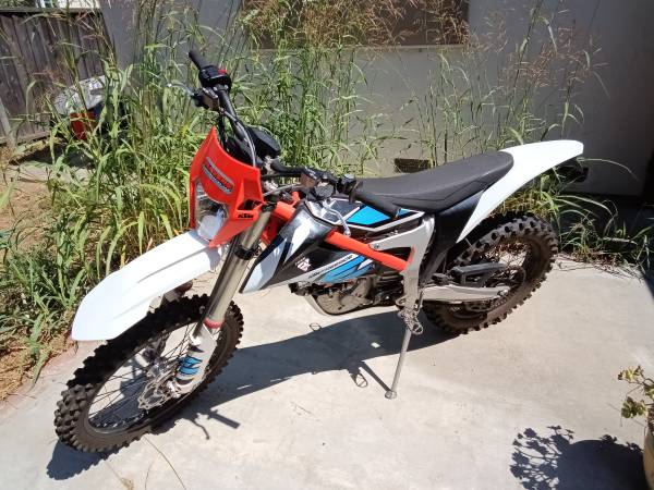 2024 Dirtbike all electric dual sport. Versatile machine you can add some turn signals put the original trials tires on which are included and make this street legal. Works just fine well maintained. Comes with charger 220v electric dryer outlets work fine. Also 2" hitch mounted rack to transport and full knobbys which are installed on the bike. I have put heavier springs front and rear for a 200lb rider.