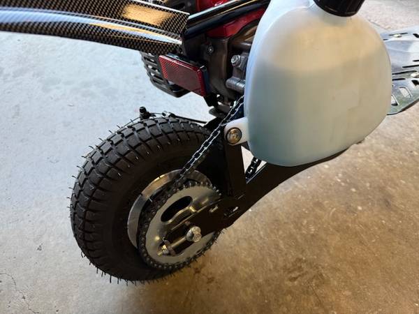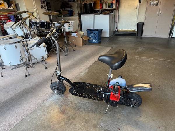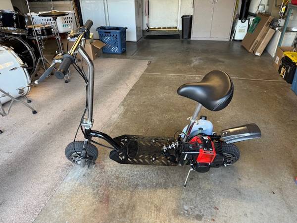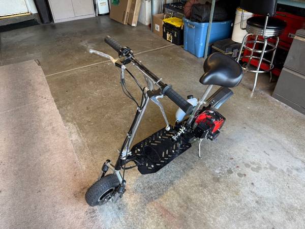Virtually brand new 49cc 2-stroke gas scooter for sale. It only has about 8-10 miles on it to test and it's brand new. Only selling because I got the 4-stroke. This thing is so fun....it takes gas so you can ride all day long! Comes equipped with dual disc brakes, twist throttle and adjustable seat. Takes 2-stroke mixing oil. Maximum riding weight is 275 pounds. Nothing wrong with this scooter! Pick up with cash only.