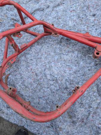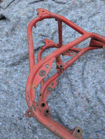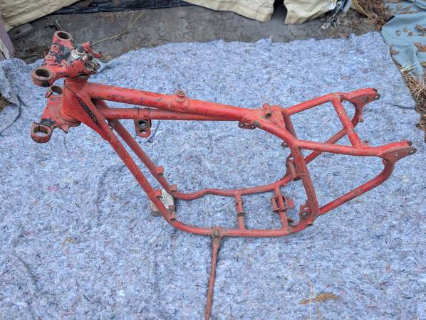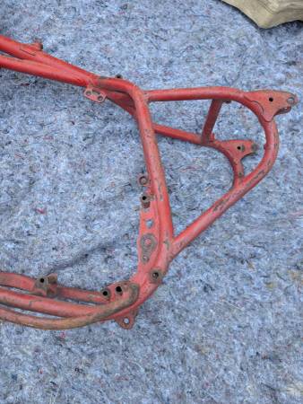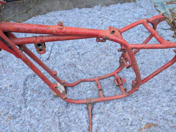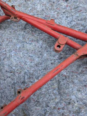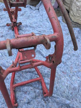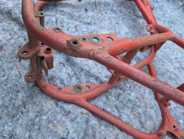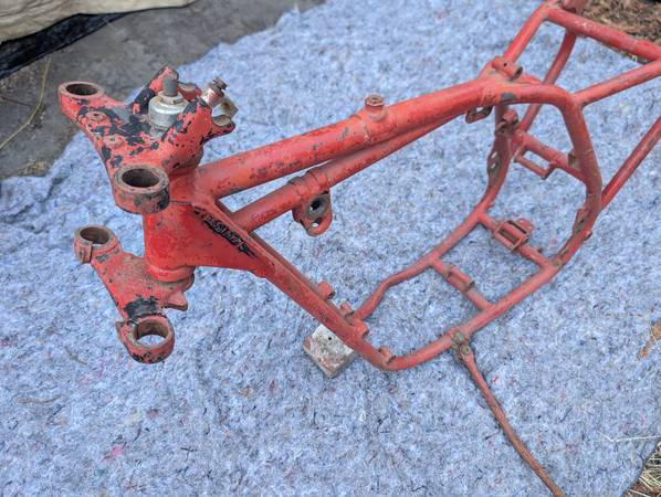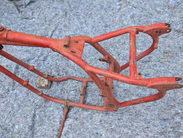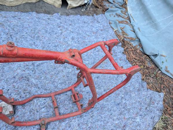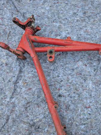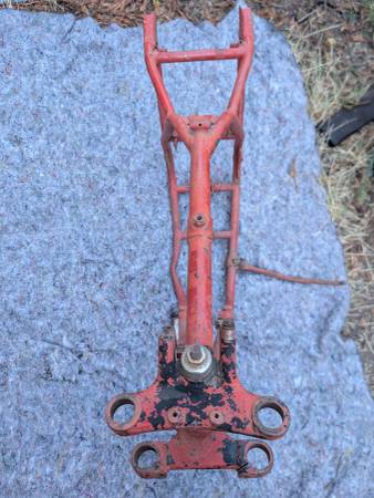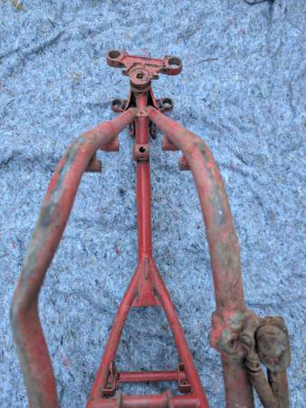 Frame number stamping CB32 10779 is clean clear and unmolested, frame is straight, mostly intact and in VERY GOOD condition - once you get past some Previous Owner's color choice! Witness marks where the rear frame loops have been removed show that this was originally a Clubman frame that was "modified" for off-road competition - not an unusual fate for Gold Stars out here on the West Coast... Further evidence provided by weld repairs on the two spots that tend to crack when these frames are used in anger - the battery tray/oil tank mounting cross-tube and the bottom cross-tube under the engine. Both repairs could use a clean-up but are otherwise sound. On the other hand, all the other lugs/bosses/brackets that typically get chopped off are still there - tank buffer and top mount, head steady, seat mount, center stand mounts etc - and the main frame tubes are not completely hammered on the bottom. Sidestand lug also intact, mounting lug has been welded on with a later stand installed. Down tubes straight, steering head unmodified, original Gold Star steering stem and triple clamps/fork yokes included. Note that the frame stops on the lower clamp have been drilled and tapped for bolts and lock nuts required when clip-on handlebars are fitted - a feature unique to the Clubman Gold Star models...