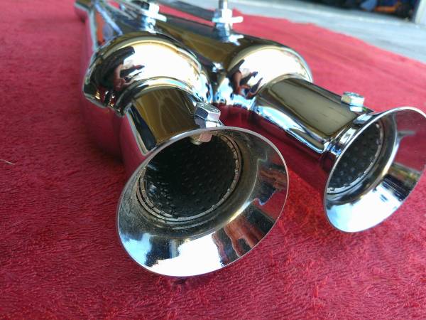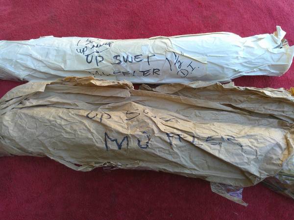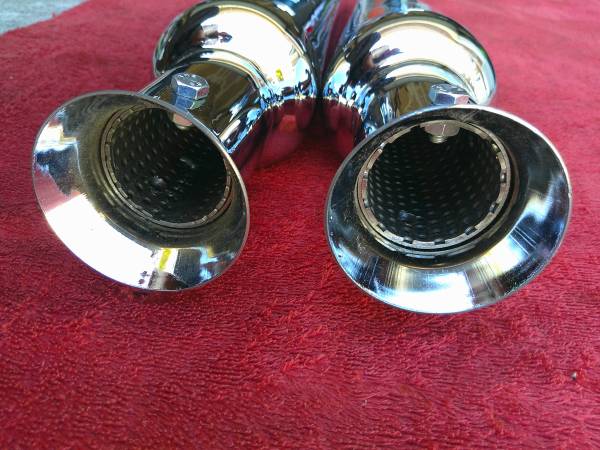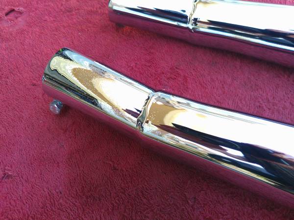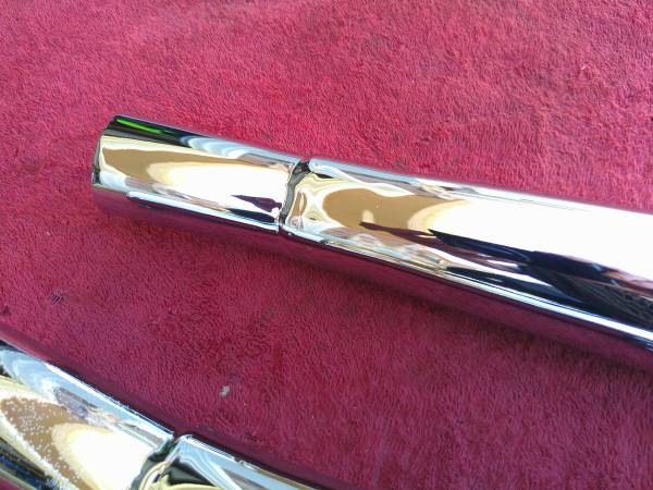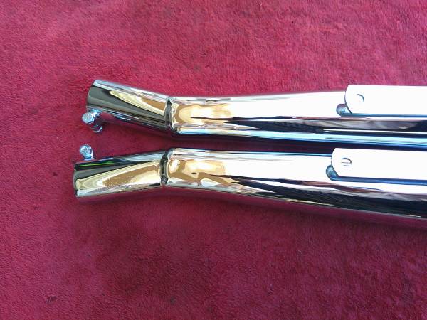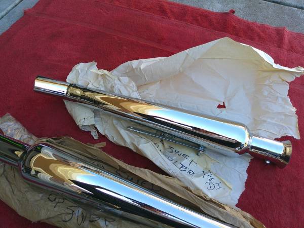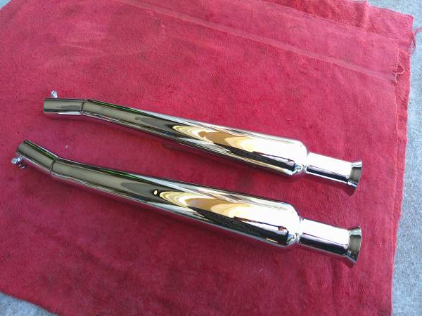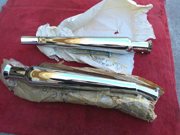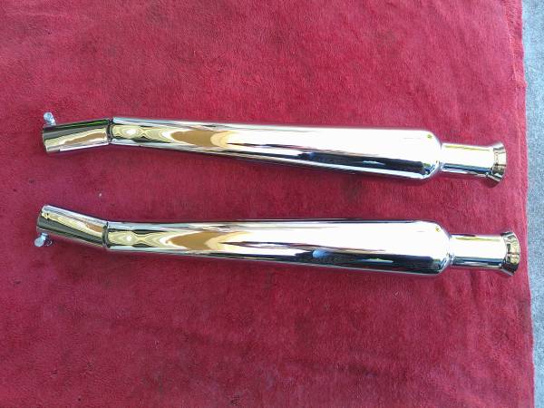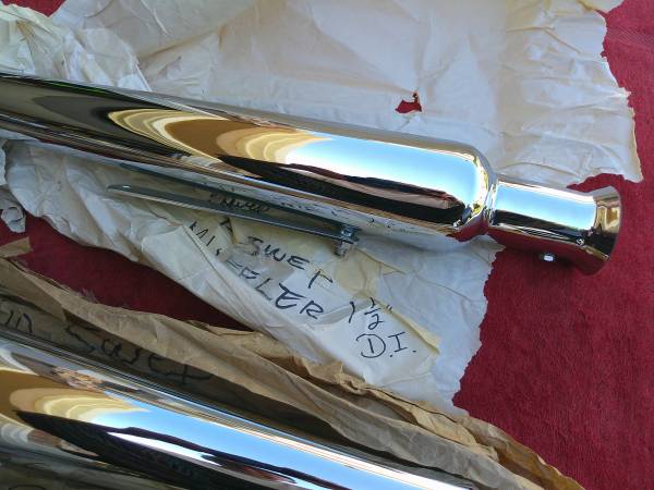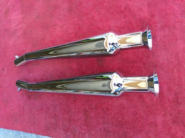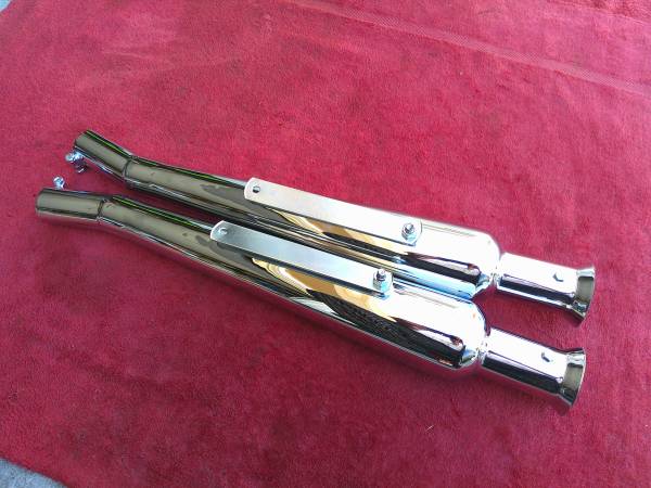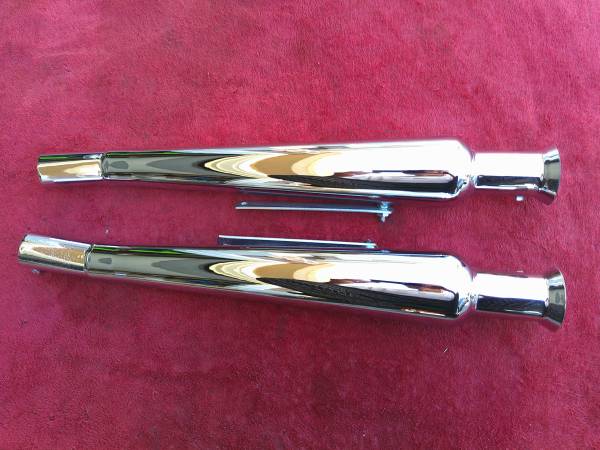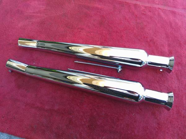 PAIR New Left & Right 1 1/2" CUSTOM "COCKTAIL SHAKER" UPSWEPT MUFFLERS or SILENCERS for sale in San Jose CA $225 or BEST OFFER, Never installed, dry storage for years, unwrapped for the first time to shoot the pics... CHROME is FLAWLESS! Overall length 22". universal mounting brackets 7 1/8" long, mounting holes on 6 1/4" centers, removable baffles. 1 1/2" ID, built-in mounting clamps with clamp bolts and nuts. The GO-TO Custom Silencer for choppers, bobbers and custom street rods back in the day, these are thought to be UK-Made reproductions - QUALITY is EXCELLENT! PERFECT for your Triumph, BSA, Norton Matchless, Harley or any other vintage bike with 1 1/2" exhaust pipes...