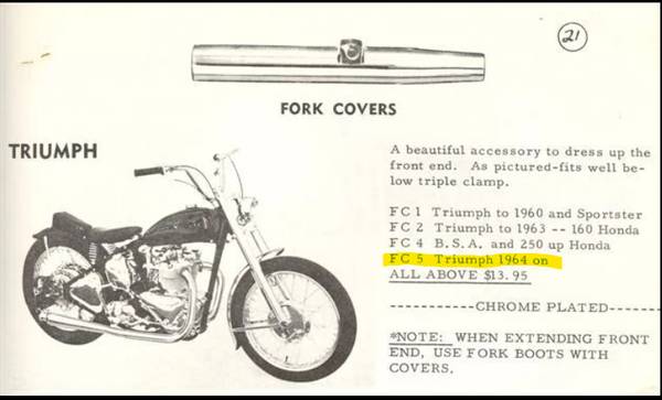 NOS MCM TRIUMPH 650 FORK COVERS, STILL IN PLASTIC! MODEL #: FC-5, FITS TRIUMPH 1964 ON. $175 Triumph, BSA, Chopper, Bobber, Custom, Flat Track