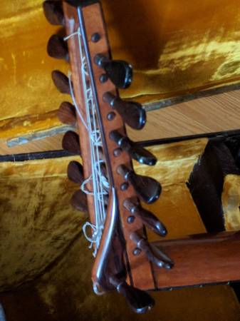 It's Spruce Top, Tiger Maple Back, Mahogany Neck, Ivory Nut and Rosewood Pegs; comes with its original and strong leather/metal case.