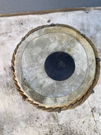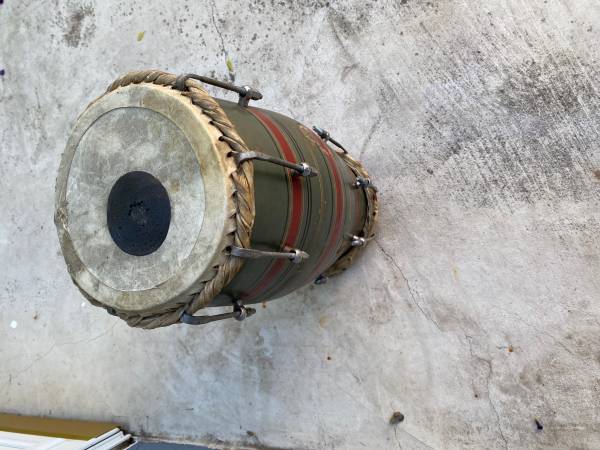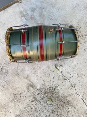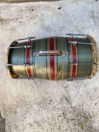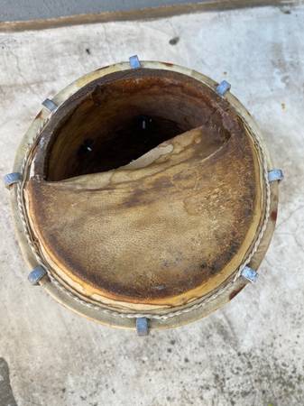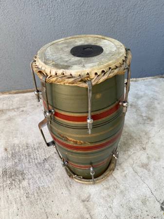 Vintage percussion drum It’s believed to be a Mridangam Selling as is as shown. Unique double sided. One side needs new skin. 17” tall Top is 8” wide Bottom is 6 1/2” wide