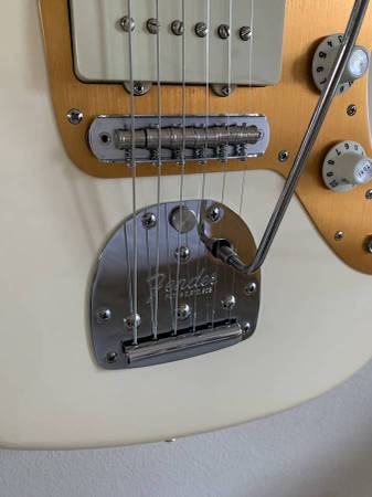Genuine Fender American Pro Jaguar / Jazzmaster bridge features single groove Mustang style saddles and 9.5″ radius. 2-1/16″ string spacing. Includes hex wrench for adjusting height.