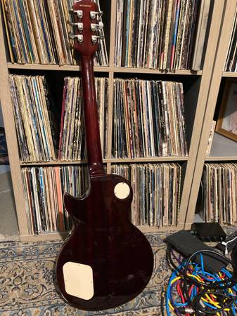 Cool epiphone Gibson reissue. Clean with the exception of some chipping on the knobs and a small finish reaction by the nut from a stand or something that you can see in the pics but no breaks or repairs. Cool more sparkly finish than its Gibson counterparts in my opinion. No case or bag. Thanks for looking