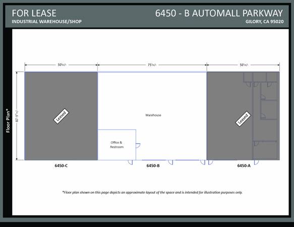 This unit is located within a multi-tenant industrial complex located along Automall Parkway at the south end of Gilroy. The space is mostly open warehouse with a small office/restroom buildout at the front corner, which provides good flexibility for a variety of industrial uses.
