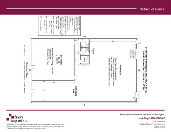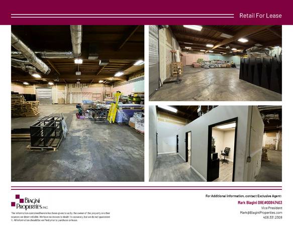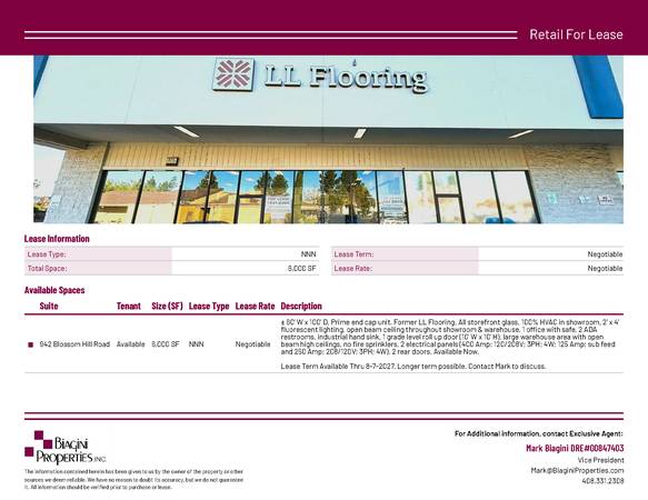 ± 60’ W x 100’ D. Prime end cap unit. Former LL Flooring. All storefront glass, 100% HVAC in showroom, 2’ x 4’ fluorescent lighting, open beam ceiling throughout showroom & warehouse, 1 office with safe, 2 ADA restrooms, industrial hand sink, 1 grade level roll up door (10' W x 10' H), large warehouse area with open beam high ceilings, no fire sprinklers, 2 electrical panels (400 Amp; 120/208V; 3PH; 4W; 125 Amp; sub feed and 250 Amp; 208/120V; 3PH; 4W), 2 rear doors. Available Now.
