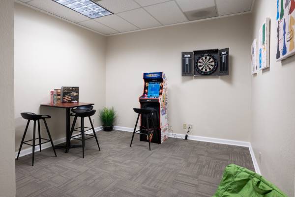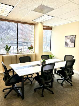 For lease is a 2200 Sq Ft. fully furnished office space. The space is comprised of a spacious reception area, a large shared common area with 18' long conference table with 60" monitor great for presentations and speeches and also includes a portable PA system. There are 5 private office suites that are currently furnished and set up as two conference room with tables, chairs and monitors, a kitchen/storage room, a private meeting room and even a small gaming room for relaxation, fun and team building.