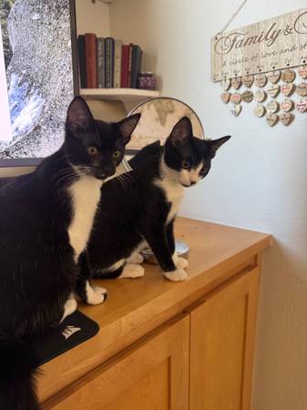 We are downsizing to a smaller house where pets are not allowed and are looking for good homes for these two adorable sisters. They are six months old, have all their shots, and must be adopted together. They are super sweet and social. Love to play or just snuggle on your lap. Good with dogs and other cats.