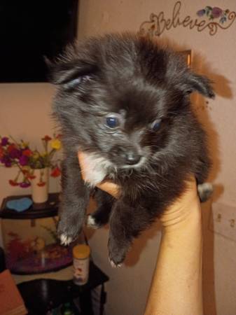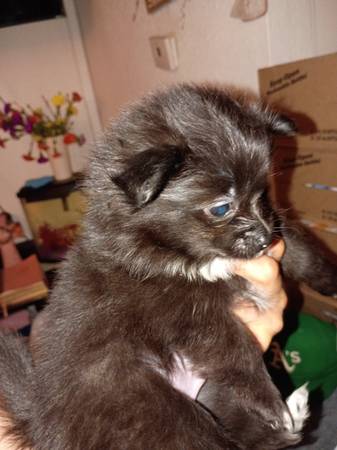 Two different Pomeranian puppies . $700 each all white fluffy 8-week-old puppy one all black with a white tuxedo.. see photos. I have own the mother dog who is all black with a white tuxedo Pomeranian she had a total of five puppies whom found wonderful happy homes ,but only two are left for sale they're both males. And the father is in all white Pomeranian.