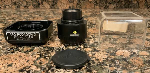Rodenstock APO-Rodagon D 75mm F4.0 lens in like-new condition with its original case and lens cap. For optimal reproduction ratio please see the attached spec sheet. The 3rd photo shows its adaption on a Sony A7C II. Adapter and the extension tube can be an option for another $50, should it fit your need. Cash or Venmo on pick up only at 1390 Saddle Rack Street, 95126.