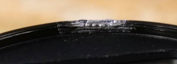 The good news is that you can still screw in lens filters into this dented section. The bad news is that it takes a lot more rotational effort to screw in a lens filter, as there is some small warping of the filter threads at the site of the dent. Due to this warping, a filter can only rotate into place about 75% of what would be normal. Normally, it would take 4 full turns (360-degree rotations) of the filter to completely secure it. But with the dent, you can only rotate a filter 3 full turns. The good news is that once you complete the 3 full rotations, the filter is securely held in place and won't fall off.