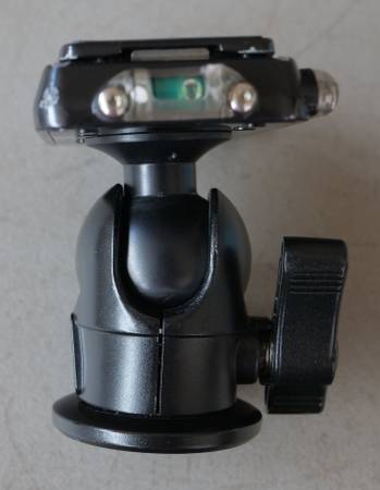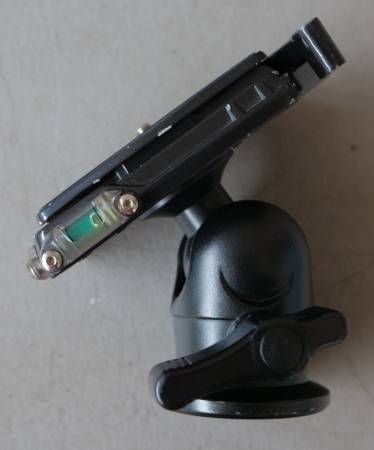 The ball head and QR plate are also in excellent functional and cosmetic condition. The pan and tilt lock lever opens and locks perfectly. The ball head moves smoothly when unlocked, but it remains stationary when locked. The QR plate fits perfectly in the QR bracket atop the head. And the mounting screw hole is in perfect condition.