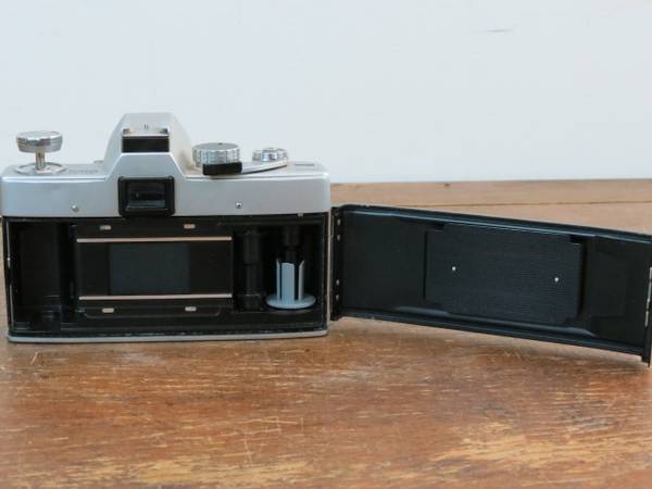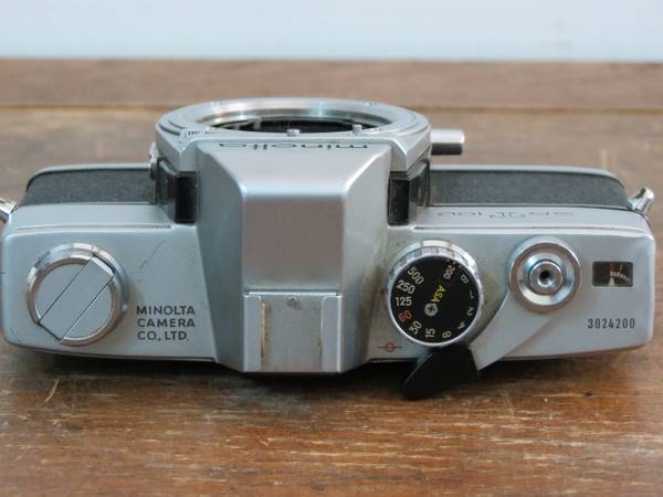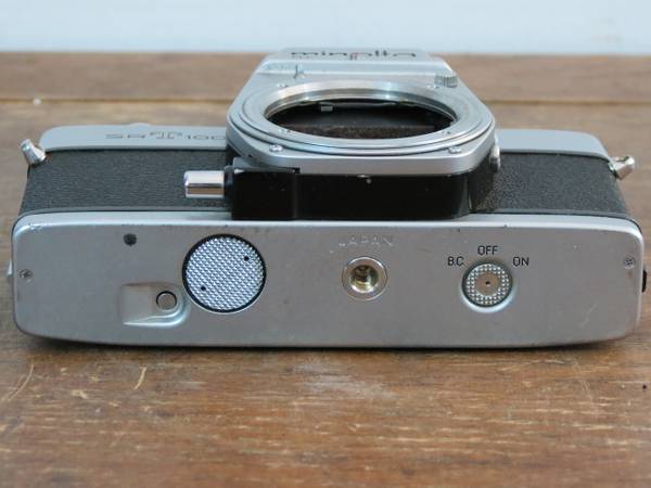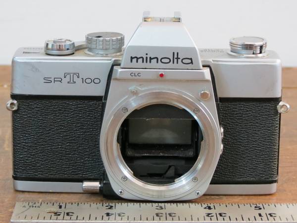 Up for sale is one used Minolta SRT-100 35mm single lens reflex camera body in good cosmetic condition in need of repair. I used this body as a source for a gear that broke in my camera. The part is a plastic gear in the bottom with some broken off teeth. The film advance is currently jammed. The camera was working OK until cannabalized except it would hang up on the very slow shutter speeds.