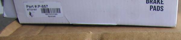 Inner Box 2: 2 sets of front wheel disc pads (4 pieces) with hardware, part number P-857 (see photos)