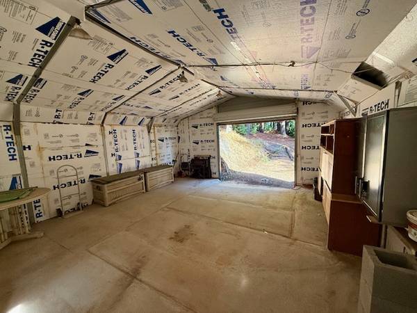 I had no idea that when I left the forest the property opened up to a gigantic area with more dwellings and storage containers and gems! A garage/workshop is wired with electricity with lamps and so many propane tanks and gas cans. There is an additional one room metal framed house/garage fully insulated with a fold up door. There is an old 5th wheel with a working water spigot and septic. Then finally there is the main house metal framed with a wooden door on one side and a sliding glass door on the other. electric wooden stove, stained glass windows waiting to be installed, extra doors, gas/electric heater in one. The other items that I saw that seemed cool and worth notating were an old milling saw, old cast iron heavy duty tub and some rolls of plastic trash fencing. (please note the one blue shipping container had been removed)