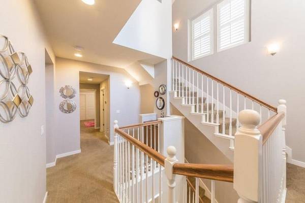 The house features modern design with crown molding, recessed lighting, large windows, and upscale fixtures throughout. It also includes smart lighting, integrated speakers, and ambient audio settings.