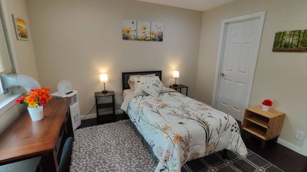 Newly furnished Master bedroom with attached bathroom for your convenience, large mirrored closet, Double pane full sized window with lots of light. The full sized bathroom and half sized bathroom is shared ( My husband will be using the full sized bathroom for showering ONLY). Very close to SJSU (10 Min. drive, 30 Min. bus–includes walking time and 20 Min. biking)! WE PREFER FEMALE ROOMMATE. Street parking. Sorry, no guests. Prefer 6 Month lease but can negotiate. Have good standing rental history, employment and past rental references. If you are a full time student, then we will need proof of financial responsibility. Requires a $750 security deposit upon move in. Move out requires 30 days prior notice otherwise lose security deposit. Room comes with small fridge, Microwave oven, Room A/C init to keep things cool, Brand new twin sized bed with ten inch memory foam mattress, two end tables with two lamps ( The lamps Have USB ports built in for charging Phones etc.), drawers and storage cubbies for clothes etc. in closest, study desk and chair with lamp, flower wall art. Utilities & Wi-Fi are includes with reasonable usage. Light cooking is allowed. Pets, smoking and drugs are not allowed. There is a large patio area available with Barbeque. Laundry is available once a week. We have one cool male Tabby Cat that is friendly and mellow. 32 inch Roku TV that includes Netflix, Prime video and all the available streaming from Roku. Bluetooth earphones in the bedroom so you can listen as loud as you want day or night!
