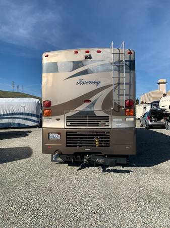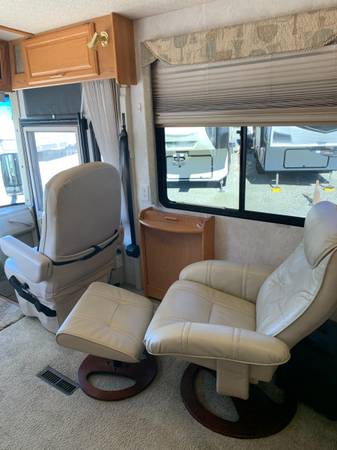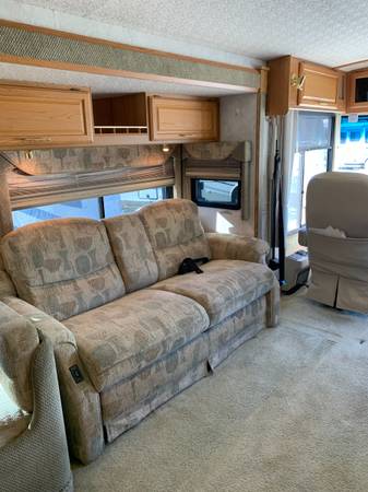 330 hp Caterpillar Diesel Pusher. 6 speed Allison Transmission. Engine exhaust brake. Engine heater. 90 gallon fuel tank. 30 gallon fresh water tank.Bedroom and living room slides. Double door Ref. and Freezer. Ref. runs on electric or propane. Hydraulic jacks. Air Brakes. Air bags. Color/sound Rear View Camera. Walk around queen bed both sides. Dinette seats 4 with storage under cushions and makes into a bed. 7.5k watt generator. TV in L/R with sound bar. TV in bedroom. Private toilet area.Water heater works on propane or electric. Electric motor converts L/R couch into a bed. Microwave convection oven. 3 burner stove top. Radio with C/D player and front and rear living room speakers. Forced air heating and heat exchanger. Basement A/C, (Not on the roof) Certified for (CARB) California Air Resource Board until Oct. 2026. Roof replaced 3/2019. House Batteries replaced 6/2025. New Microwave convection 2024. Allison Transmission oil changed 3/2025. Gel coat is pealing causing paint to discolor. Some scratches on sides. Personal items in bays shown in pictures not part of this sale. Very nice floor plane, notice in pictures bedroom entry is hidden from view from living room.