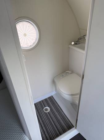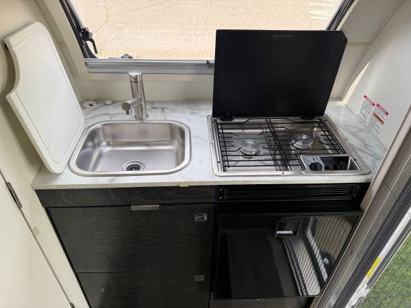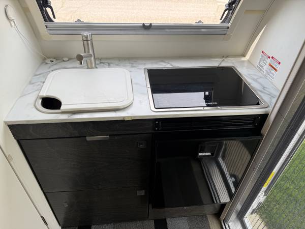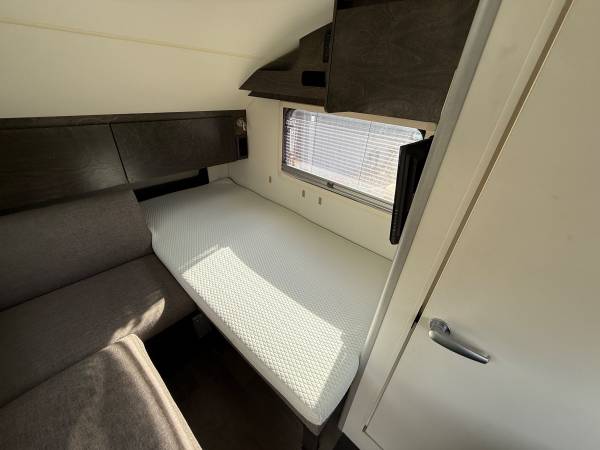 Inside, you'll find a cozy and well-appointed living space that includes a comfortable bed, kitchenette, dinette, and plenty of storage. The modern design and high-end finishes give the interior a luxurious feel, while still maintaining a compact and efficient layout.