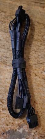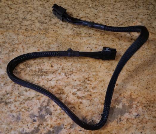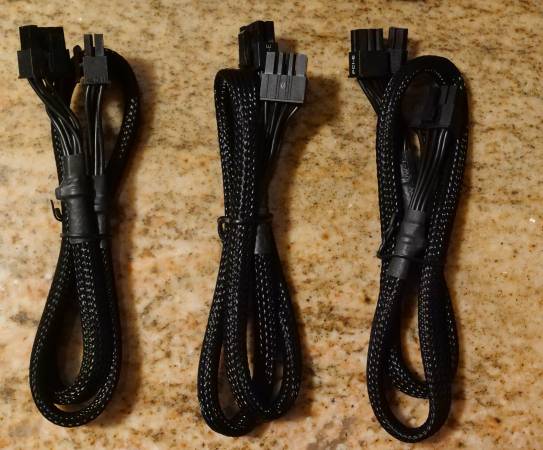 I have three (3) Corsair brand connector cables for sale. All of these are sleeved cables. These attach to many different series and models of Corsair brand modular desktop computer Power Supply Units (PSU). These add extra power connections to PCI-E video cards / graphics processing unit (GPU) cards.
