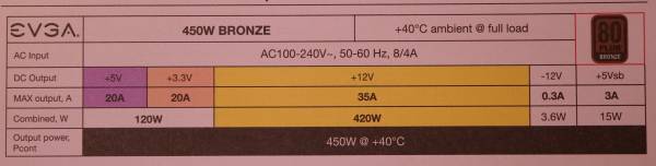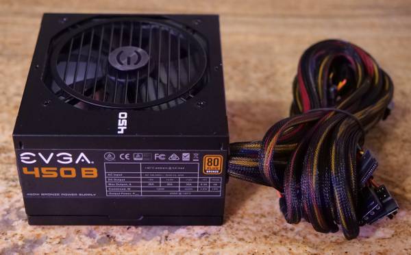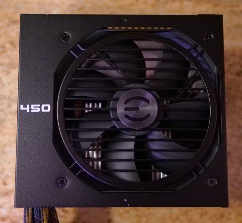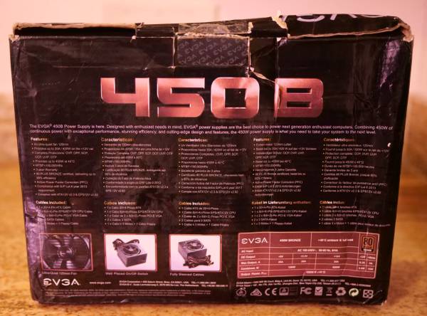 For sale is a new, never used EVGA brand desktop computer Power Supply Unit (PSU). This is model number 450B. This is a standard ATX-sized unit that's capable of 450 watts of continuous power. It has attached, non-removable cables that are about 24" long. The PSU has the standard 20+4 pin and 4+4 pin motherboard connectors. It also has a two 6+2 pin PCIE connectors for two video graphics cards. There are six SATA connectors and three Molex connectors. Complete technical details are listed below.
