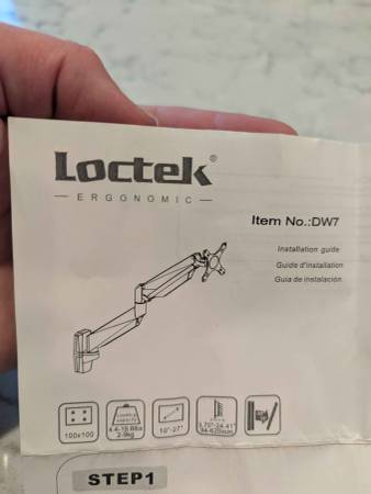 Selling a lightly used Loctek DW7 silver & black wall‑mount monitor arm, ideal for freeing up desk space while adding ergonomic adjustability.