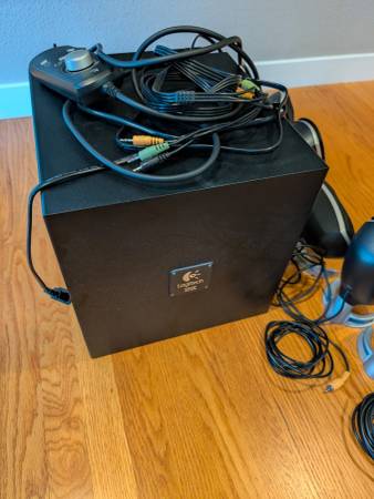 The Logitech Z-5300 is an excellent 5.1 surround sound speaker system. All parts are included (5 speakers, 1 subwoofer, wired remote, triple-trrs cable to connect to system) and has been in a smoke- and pet-free home. The 5 speakers have stands, and can also mount to the wall.