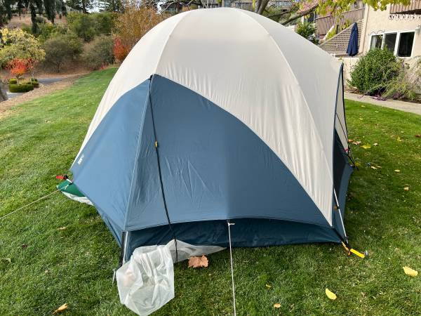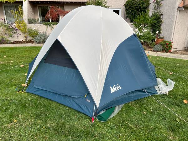 For sale is an REI "Base Camp" family tent that sleeps 4. This tent is approximately 10 years old but used only 10 nights. Always stored clean and dry. Poles and stakes are included. You must provide your own ground sheet (I used a piece of heavy plastic sheeting). This tent is heavy and not suitable for backpacking.